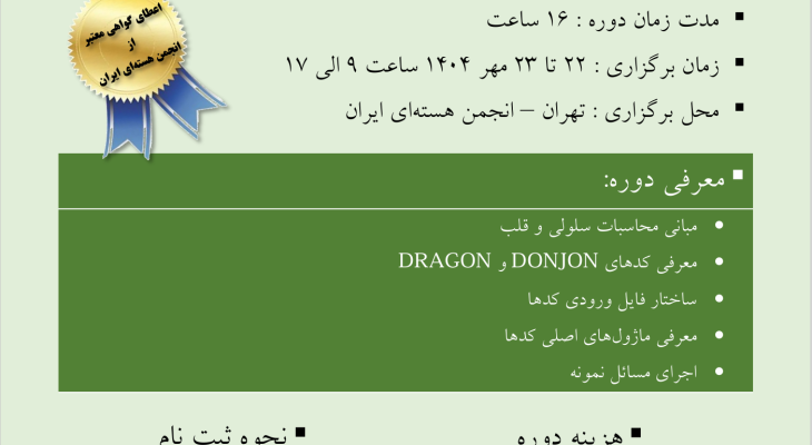 ادامه مطلبکارگاه آموزش آموزش کدهای محاسبات قلب DONJON & DRAGON مدرس: عضو هیئت علمی دانشگاه 22 و 23 مهرماه 1404 از ساعت 9 الی 17 پرداخت کارگاههای آموزشی “*” indicates