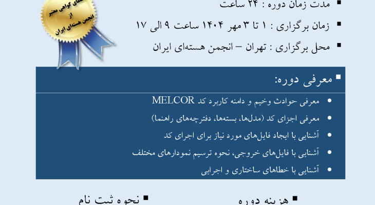 ادامه مطلبکارگاه آموزش آموزش کد تحلیل حوادث وخیم MELCOR مدرس: کارشناسان مرکز محاسبات پیشرفته هستهای 1 الی 3 مهرماه 1404 از ساعت 9 الی 17 “*” indicates required fields Hiddenتعداد روز*