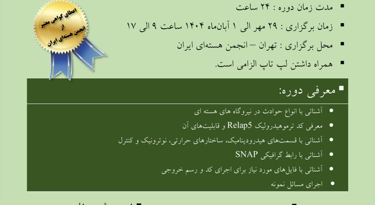 ادامه مطلبکارگاه آموزش کد محاسبات ترموهیدرولیک RELAP مدرس: متخصص صنعت و مدرس دانشگاه 29 مهرماه الی 1 آبانماه 1404 از ساعت 9 الی 17 ظرفیت کارگاه تکمیل شد.